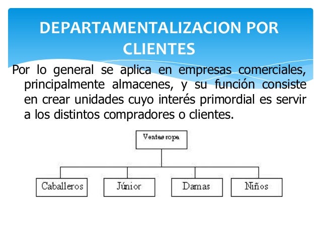 4. Por clientes: Muchas empresas suelen agrupar sus actividades para que reflejen un interés primordial en los clientes, que son la clave de la estructura cuando cada grupo de clientes es administrado por un gerente de departamento.